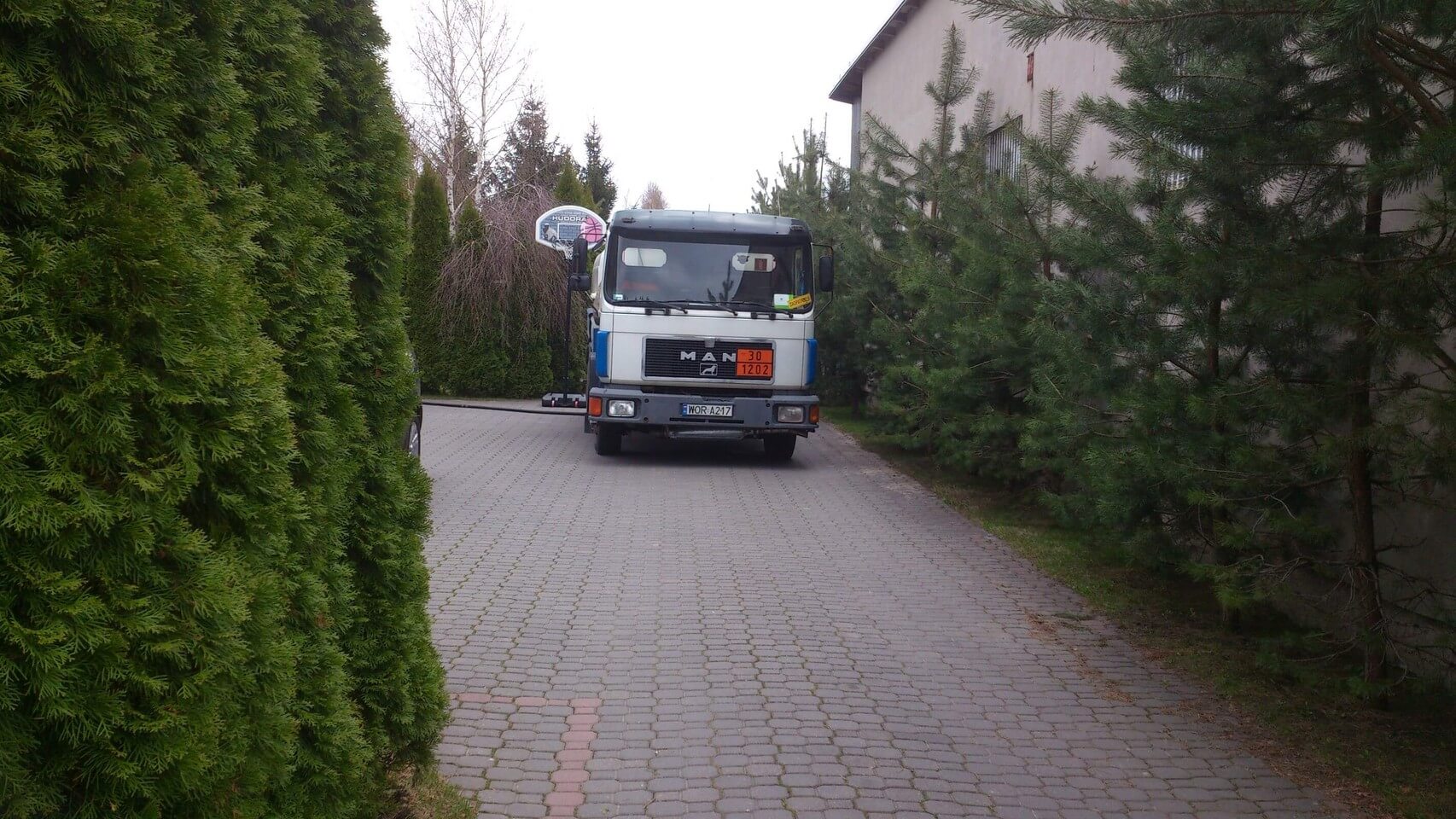 Przejazd betoniarki sąsiada pod naszymi oknami i drzwiami po wąskiej działce - po wspólnym gruncie i naszej nawierzchni do … własnego zysku i szczęścia!